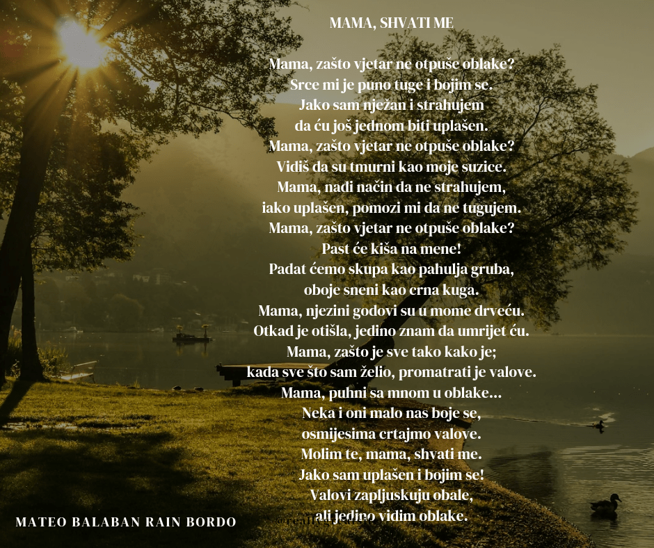 Rain Bordo pjesma Posted on Feb 27, 2024 by Mateo Balaban Mateo Balaban Mama, shvati me Share this: Share on X (Opens in new window) X Share on Facebook (Opens in new window) Facebook Like Loading... Related