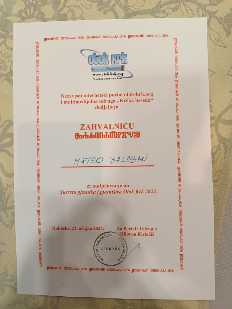 Show Posted on Mar 22, 2024 by Mateo Balaban Meeting of poets and poetry of the island of Krk 2024. Malinska, Hotel Malin, 21.3.2024. Share this: Share on X (Opens in new window) X Share on Facebook (Opens in new window) Facebook Like Loading... Related