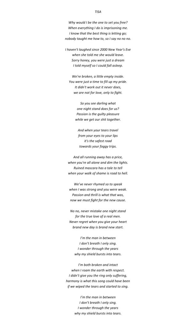 Despite its melancholic tone, “Tisa” is ultimately a poem of renewal. The speaker urges, “Never regret when you give your heart / brand new day is brand new start.” There is a quiet optimism here, a belief that even after loss, life offers new beginnings. The refrain, “I’m the man in between / I don’t breath I only sing,” suggests a transformation: the speaker is no longer merely surviving, but expressing, creating, and finding meaning through art.