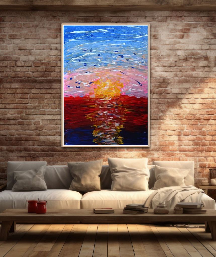 Mateo Balaban’s painting confronts us with a vertical canvas that pulsates with warmth and emotional ambiguity. The first immediate observation is the division of the work into horizontal bands of color: a celestial blue top, a fiery red center, and a deep, reflective lower half—blended together by the radiance of a sun descending or rising at the heart of the piece.