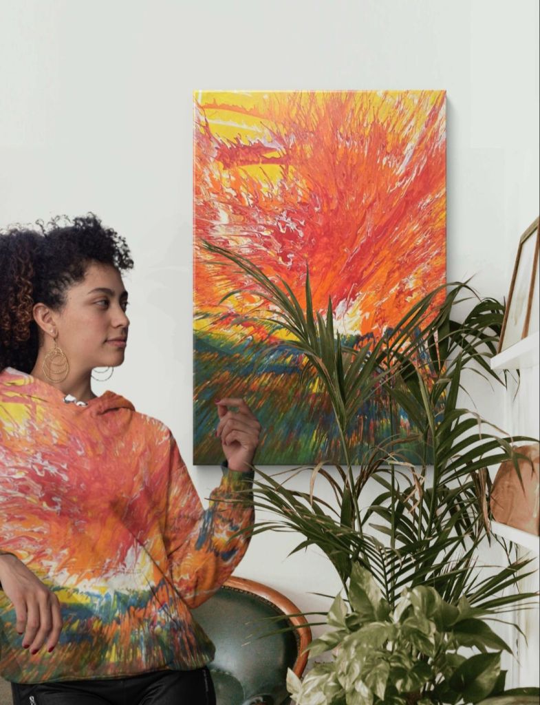 What makes this piece truly fascinating is its transformation into fashion—a hoodie that becomes not just clothing but a wearable artwork. The shift from canvas to textile adds a layer of interaction: the viewer becomes the wearer; the art, no longer confined to a frame, enters public space. The woman wearing the hoodie does not merely wear a design—she becomes part of the painting’s energy. The fabric hugs the explosion of color, folding it across a moving human body. This metamorphosis is not just stylistic but conceptual: the painting’s emotion now travels, breathes, and interacts with the world in new and unpredictable ways.