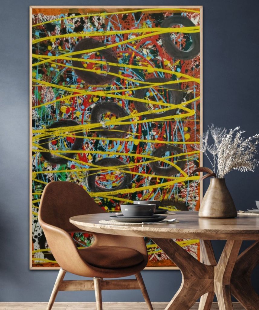 The context of placing this piece in an elegant interior with mid-century elements (as seen in the photo) amplifies its message. The juxtaposition of raw expressive abstraction against warm wooden furniture and earthy ceramics creates a psychological contrast: chaos in a space of calm, turmoil in a frame of control. This contradiction mirrors the essence of human life—we present calmness while internally negotiating storms.