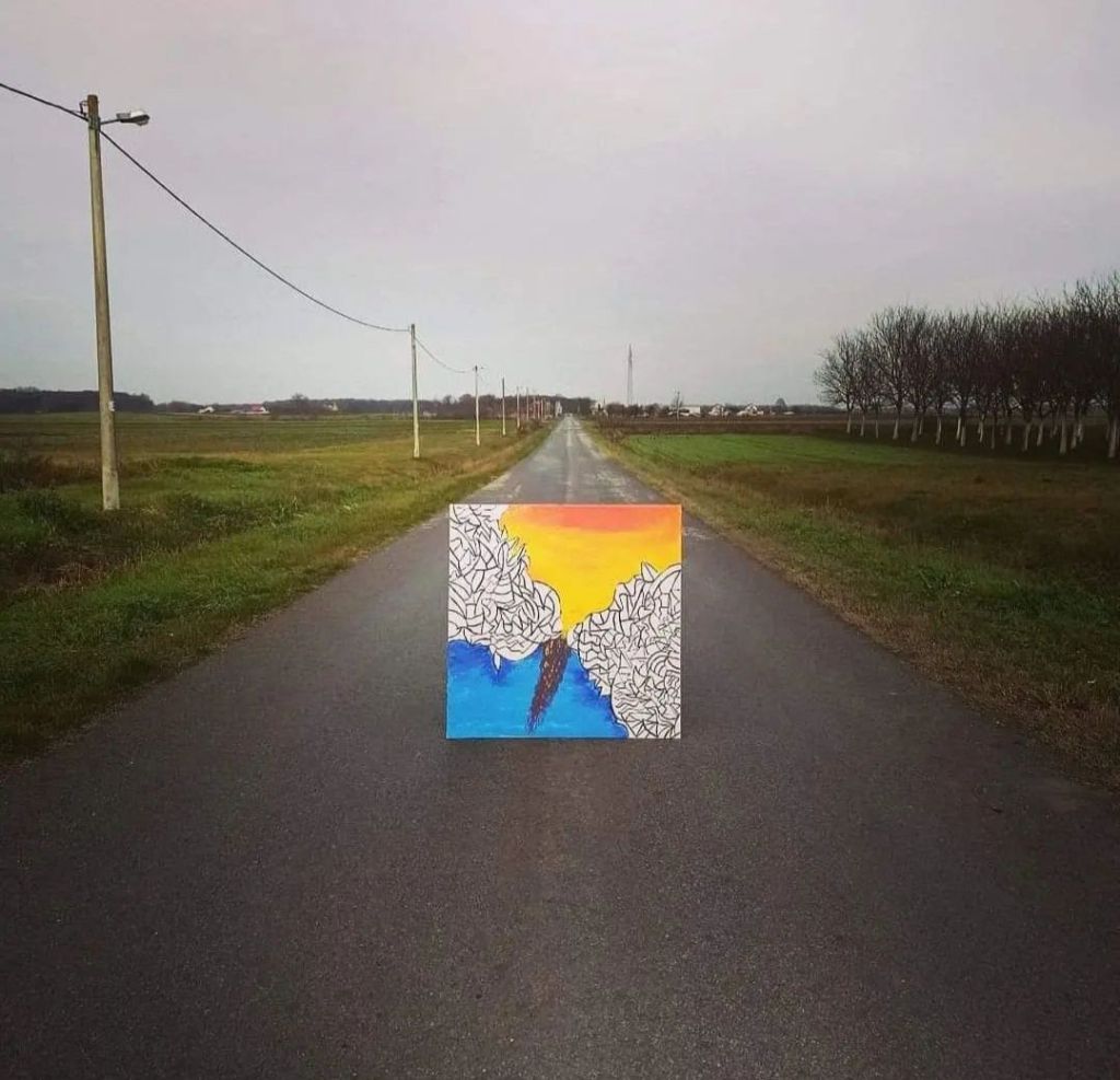 Balaban’s act of placing the painting on the asphalt transforms the road into a gallery of existence. It’s as if the painting is both a mirror and a continuation — a reminder that even the endless road needs a heartbeat, a human intervention, a trace of empathy. The road, often seen as desolate, becomes sacred through this insertion of art, much like Kerouac’s prose sanctified the mundane highways of America.