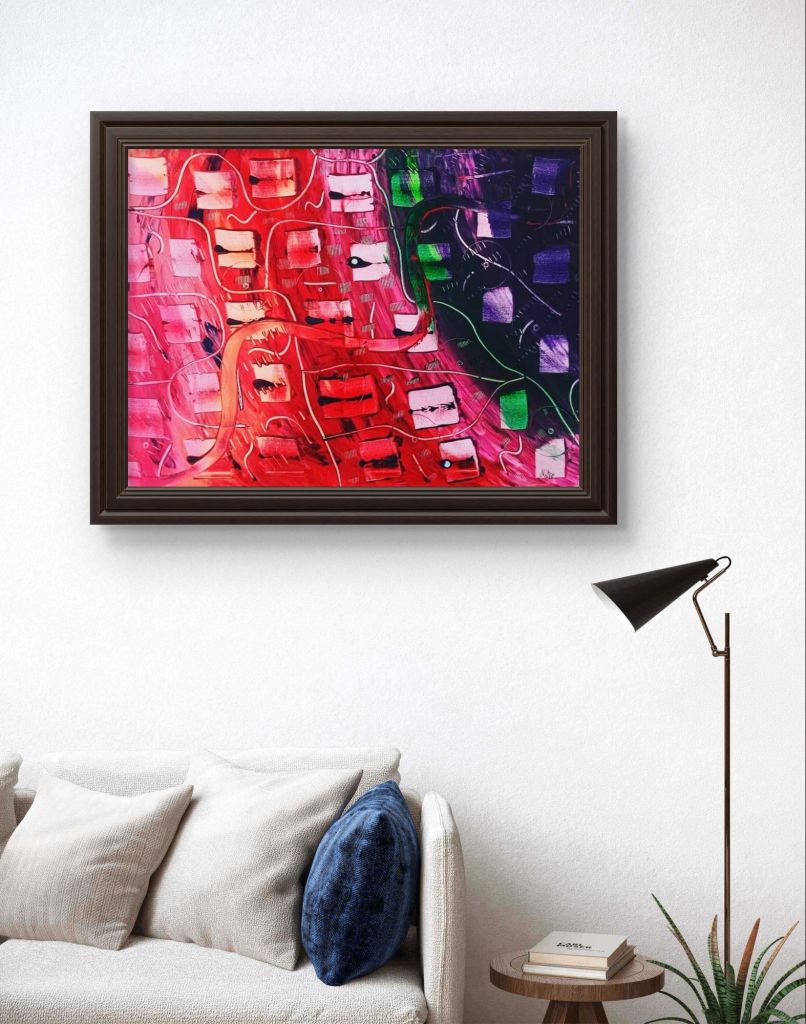 The framed presentation within the minimalist interior adds another layer of interpretation: it situates chaos within calm. The painting becomes a heart beating in a quiet room — a reminder that beneath order, there is always movement; beneath stillness, always emotion.