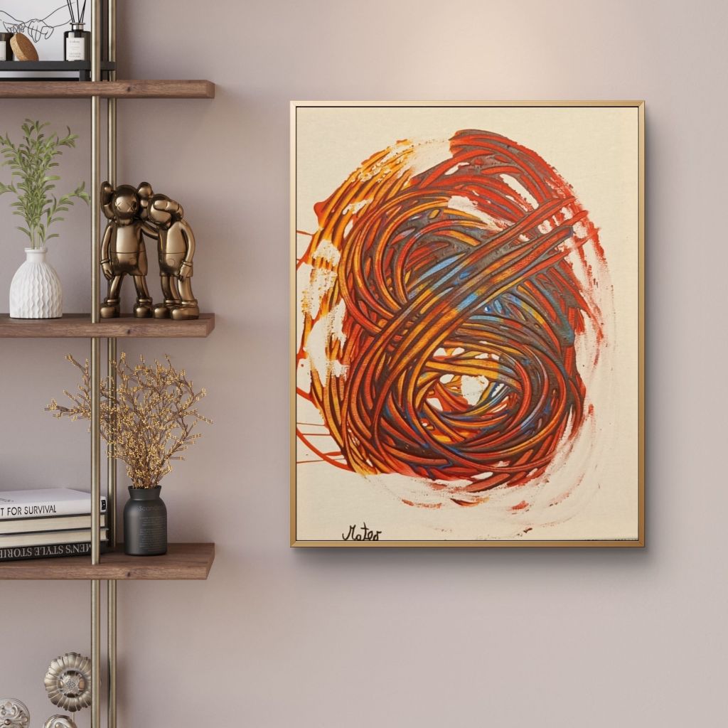 This image captures a meticulously curated interior scene that serves as a stage for showcasing an abstract painting by Croatian artist Mateo Balaban, better known by his pseudonym Rain Bordo. The photograph blends domestic tranquility with the artwork’s raw emotional intensity, creating a dialogue between serene everyday life and turbulent inner expression. Rendered in soft, warm lighting against a pale beige wall, the composition evokes a sense of intimate revelation—art intruding upon the mundane, much like Balaban’s own philosophy of transforming personal pain into unfiltered visual poetry. Below, I’ll break down the image’s elements, with a primary focus on the central painting, its stylistic and thematic layers, and its integration into the surrounding environment.