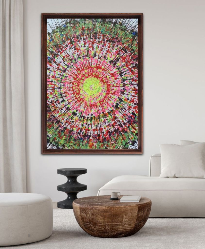 Notably, the work is presented in a warm wooden frame within a minimalist interior setting, creating an interesting dialogue between the explosive energy of the artwork and the calm restraint of its surroundings. This juxtaposition enhances the piece’s visual impact—the vibrant chaos becomes even more pronounced against the neutral backdrop.