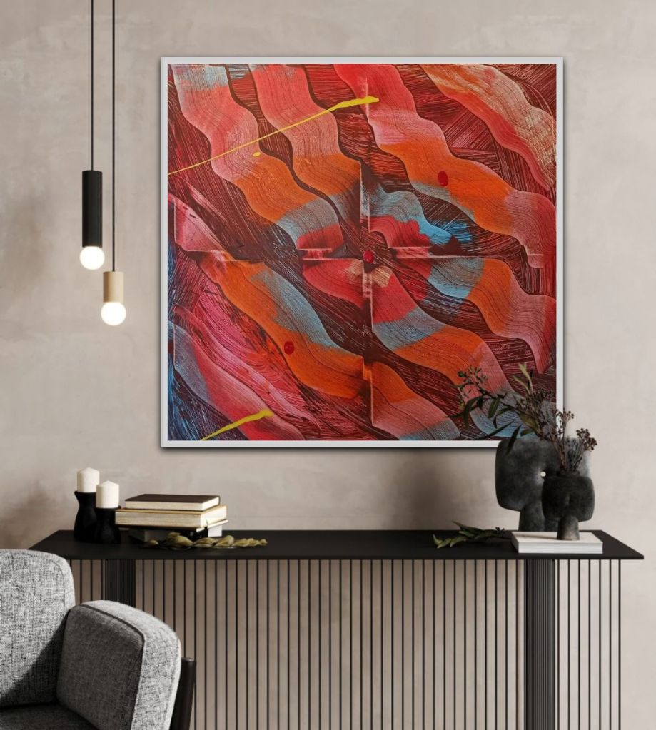 Umjetnikova paleta bogata nijansama crvene, narandžaste, burgundske i roze boje, prošarana akcentima plave i žute, odaje dojam emocionalnog vrenja. Topli tonovi dominiraju prostorom s gotovo tjelesnom prezencijom, dok hladniji akenti pružaju vizualni predah. Teksturne linije koje probijaju površinu dodaju gotovo tesktilnu dimenziju, sugerirajući slojeve iskustva i vremena.