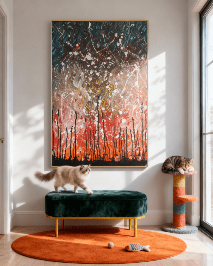 At first glance, the upper register pulls you into a swirling, almost underwater darkness—deep blues and stormy greens twisting with frenetic white splatters that crackle like lightning across a midnight sky. Then, without warning, the composition ignites. A molten gradient of searing pinks, blazing oranges, and blood-reds surges upward, devouring the darkness. Bold black vertical drips streak downward like charred trees in a wildfire or the last defiant remnants of an empire collapsing in flames. The technique is masterful: thick impasto gestures, spontaneous splatters that look as if they landed seconds ago, and aggressive mark-making that captures the exact moment the brush (or perhaps the artist’s entire soul) collided with the surface.
