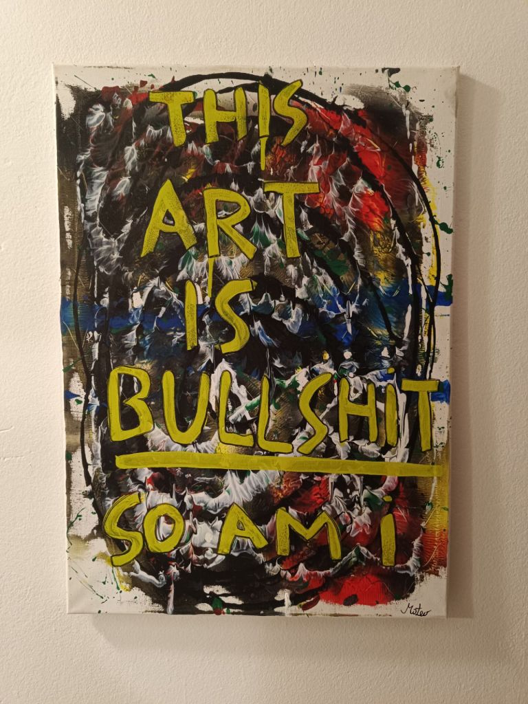 At first glance, this piece hits like a punch to the chest—raw, unapologetic, almost confrontational. The bold yellow text, “THIS ART IS BULLSHIT SO AM I,” isn’t just a statement; it’s a provocation. It forces you to react before you even understand it. And that’s exactly where its power lies.