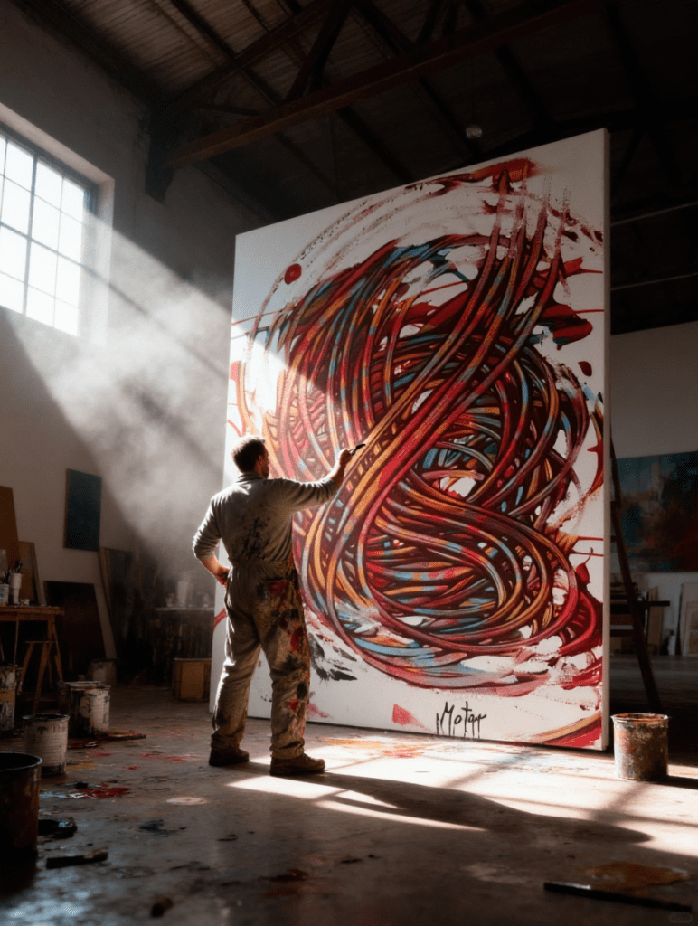 This duality mirrors his own artistic practice. He moves fluidly between painting and writing, seeing them not as opposites but as complementary forces. A canvas might explode with red and orange energy, while accompanying text poses quiet questions like “Who am I when I am not?” The apparent normality of the finished artwork — hung on a wall, viewed in a gallery — belies the emotional whirlwind of its creation.