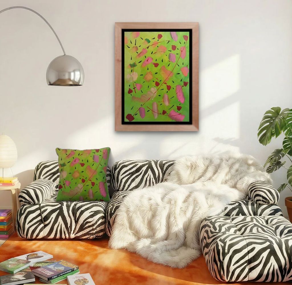 Posebno me dirnulo kako se njegov dizajn savršeno uklopio u moj životni prostor. Zebra-print sofa, bijeli plišana deka, jastuk koji sam namjerno odabrala u istim nijansama zelene i ružičaste — sve to sada izgleda kao da je stvoreno upravo za tu sliku. Kao da je soba čekala da Rain Bordo uđe u nju svojim bojama i učini je kompletnom. Svaki dan, kad sunce padne kroz prozor i obasja platno, slika oživi na novi način. Boje zatrepere, oblici zaplešu, a ja osjetim onu istu leptiriću radost koju sam osjetila onog prvog trenutka.