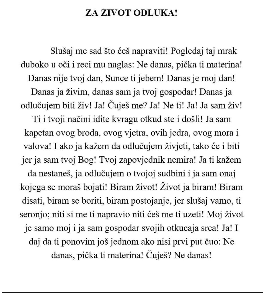 Rak Posted on Apr 28, 2026 by Mateo Balaban Posvećeno borbi protiv raka i depresije. Knjiga: Krhotine nekadašnjeg carstva, Mateo Balaban. Share this: Share on X (Opens in new window) X Share on Facebook (Opens in new window) Facebook Like Loading... Related