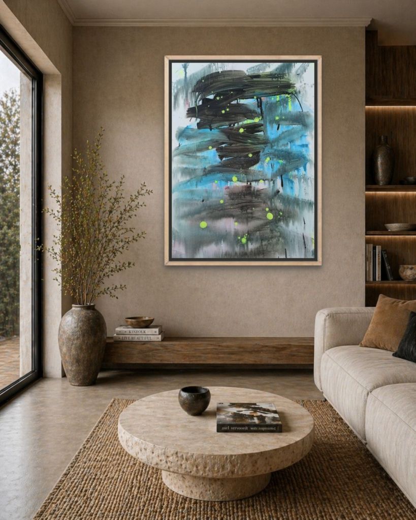 Te velike, teške, gotovo bijesne crne poteze kista koji se razlijevaju preko plavo-tirkizne podloge? To nije slikanje. To je terapija na platnu. Izgleda kao da si uhvatio četkicu i rekao: “Danas nećemo biti fini. Danas ćemo biti iskreni.”