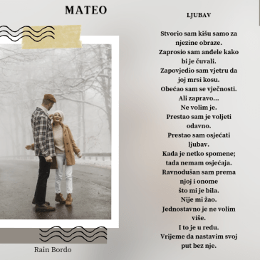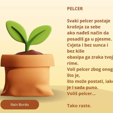 KRHKO Krhka stvarnost ogoljena do kostiju,Klara ima kćer i nosi ju.Upravo na ramenima gdje njezina sreća počiva.Njezine ruke su u njezinoj kosi. „Sreća i radost moja to si,upravo ti,dok udaraš nožicamapo mojim prsima.” Klara mi govorikako se osjeća doknosi Tinu na ramenima.